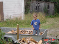 Idag så har jag och barnen tagit in ved. Barnen tog veden från släpvagnen, slängde den i skottkärran, körde veden fram till vedbon, tippade ut veden på marken och jag staplade inne i vedbon. De var så duktiga, det tog bara knappt en timme för dem att tömma släpvagnen. När far i huset kom hem från jobbet så började han att lasta släpet med ris och skräp för att köra det till den mobila återvinningsgården vid dansbanan. Det kommer att bli ett antal resor dit under kvällen, himla smidigt att bara behöva köra genom vår lilla skog för att bli kvitt allt skräp.