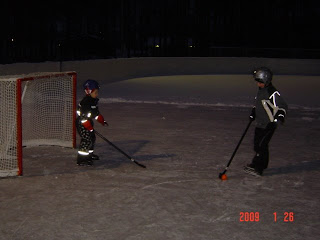 När vi åkte hem så lovade jag barnen att de skulle få åka skridskor på em. när lillebror sovit middag. Vi åt en lätt lunch och sen så var lillebror snabb på att lägga sig och han somnade mer eller mindre direkt. När han vaknat så pälsade vi på oss och åkte iväg bort till skolan och hockeyplanen. Barnen började att åka runt och strax efter så kom det en bil till och då visade det sig att 2 av storebrors klasskompisar också skulle åka skridskor, lyckat!