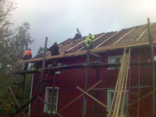 Hej å hå....äntligen hemma och får sova för natten. Det är slitsamt att lägga tak iaf förarbetet som blev gjort denna helg. Vi hann flytta ställningen och kasta allt tegel och regla upp så nu kan man i princip säga att det bara är plåtarna sen är taket rakt och fint och skall hålla för många år till. Imorgon är det måndag vilket innebär vanligt jobb igen. Frun skall få en lugn kväll för sig själv med fotvård på salongen i byn våran. Godnatt.....