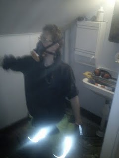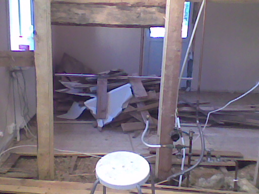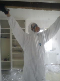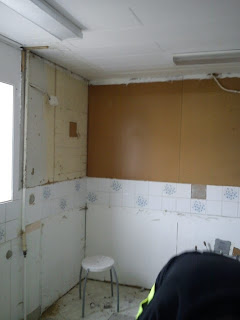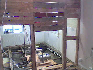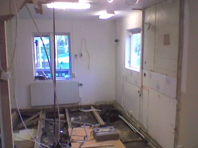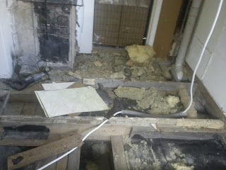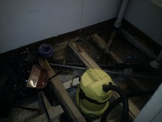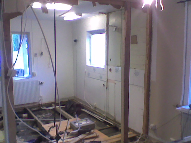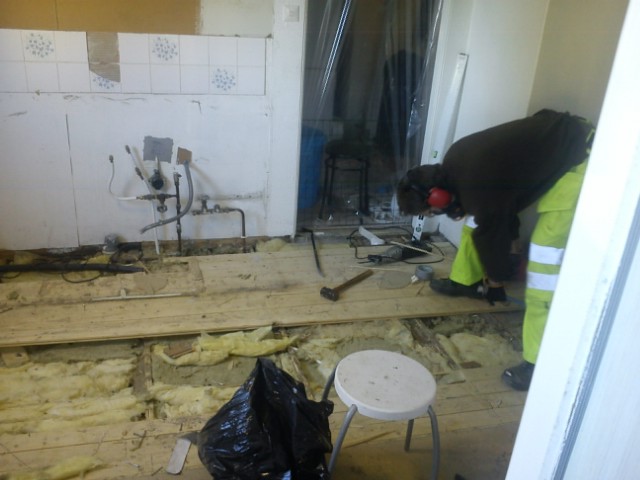 Darlingen har rivit ut golvet på toan uppe, avloppet och vattenledningarna ska bytas. Nu ska vi börja med köket och samma gäller där, golv ska rivas upp och sen drar vi nytt.