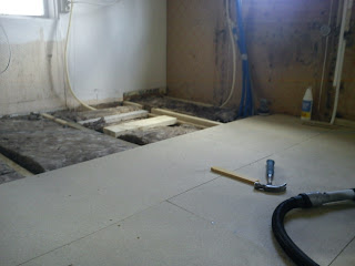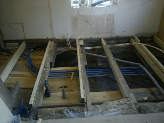 Förra veckan så kom äntligen rörmokaren och gjorde klart under golvnivå så nu kunde vi fortsätta(vi var tvungna att vänta ett par dar för att se så att det inte var något läckage). Idag blev golvåsarna på andra halvan av köket(originalköket) uppreglade, som mest fick vi höja 4 cm... Jag har även fixat avloppet och nu håller darlingen(med hjälp av lillebror) på att lägga ny trossbotten. Sen är det bara vindpapp och isolering kvar att lägga dit, så då kan vi lägga igen golvet.