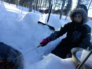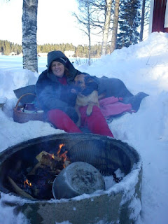 Igår så åkte vi upp till stugan för att skotta taket på den och det var verkligen nödvändigt. Ca 1m låg det nog på det lilla taket, när jobbet var gjort så pulsade vi ner till grillplatsen där Darlingen hade grävt fram grillringen under all snö och gjort upp en fin eld. Där grillade vi korv och drack kaffe. En helt underbar senvintersdag i snön... :o)